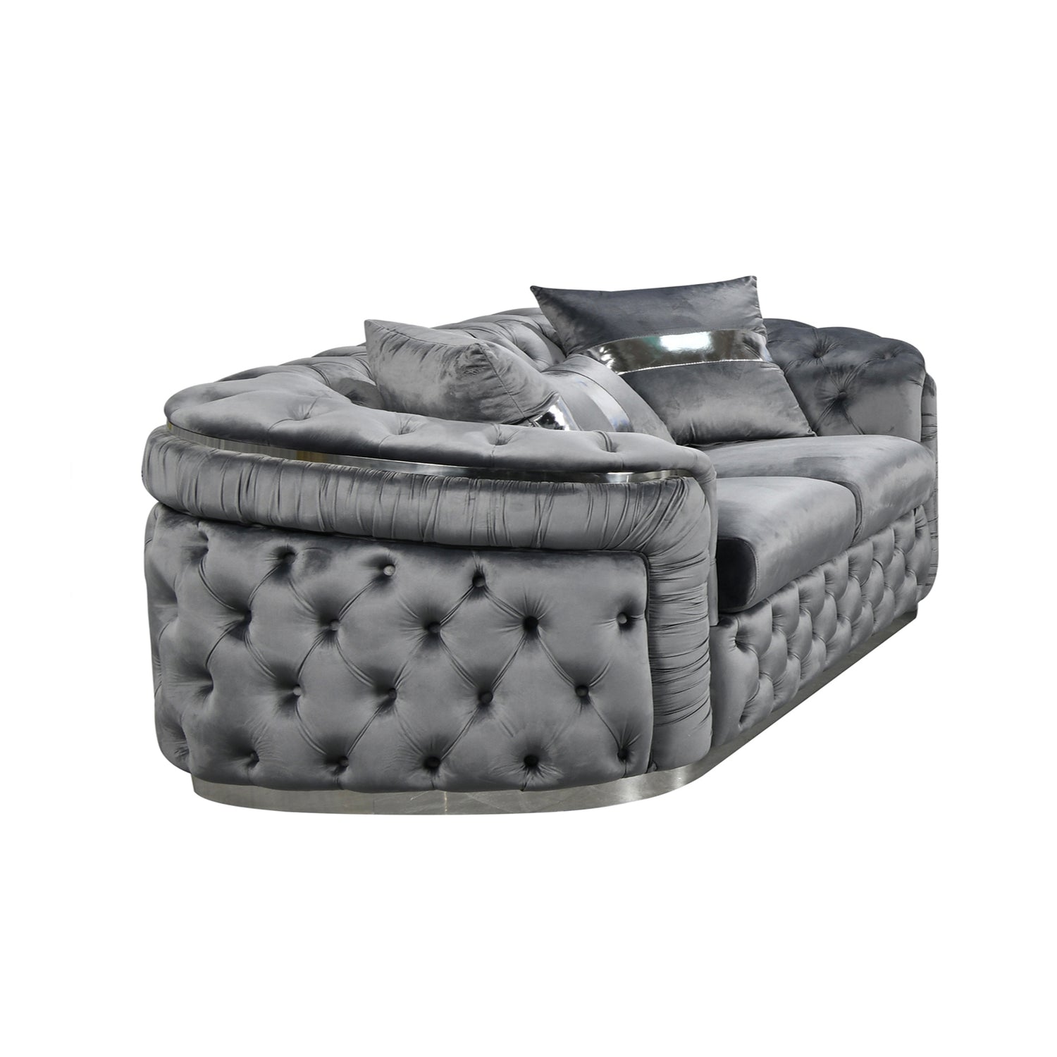 Duke sofa is finely decorated with deep quilting and upholstered buttons on high padded surface. Its design, half moon shape and golden/silver base make it a very exclusive piece of furniture in your Living room.