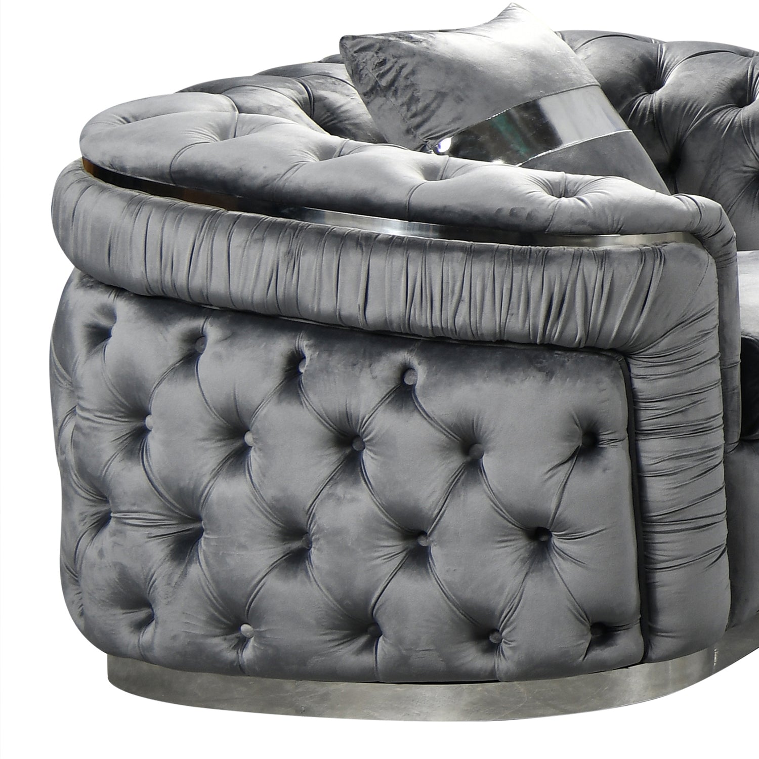 Duke sofa is finely decorated with deep quilting and upholstered buttons on high padded surface. Its design, half moon shape and golden/silver base make it a very exclusive piece of furniture in your Living room.