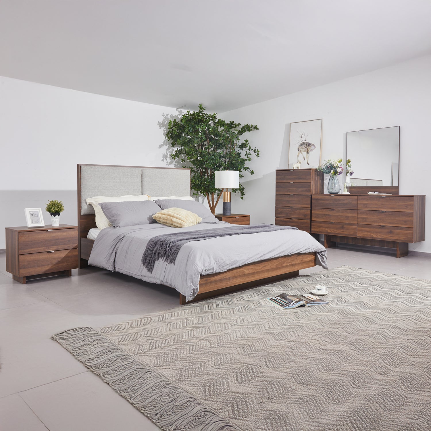 There are two drawers in the nightstand, Five Storage Drawers on Tallboy & Six Storage Drawers on Dresser where you can neatly arrange your everyday essentials and access them without getting up from the bed.