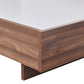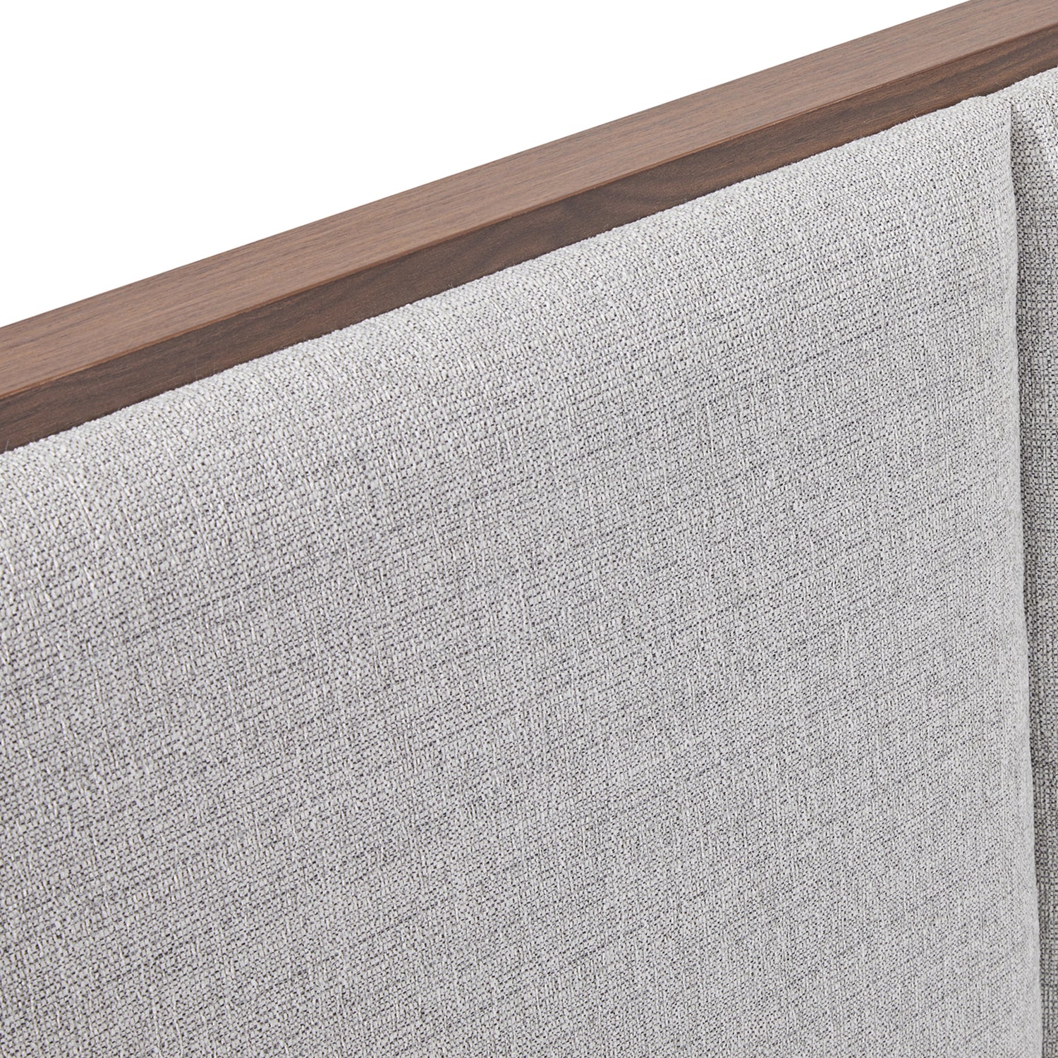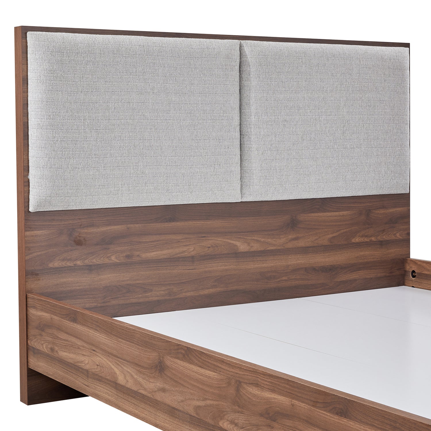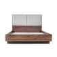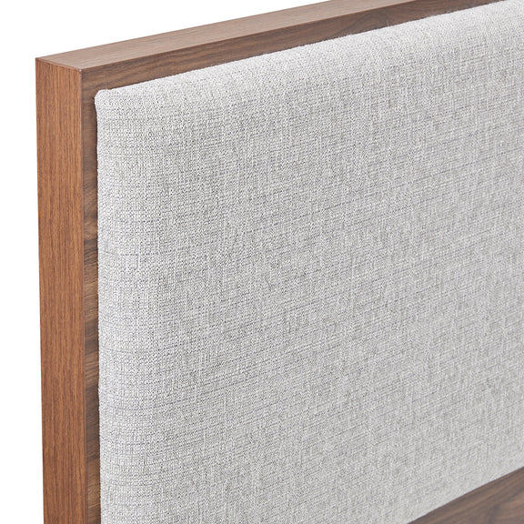 The headboard of our Myles bed frame has a padded surface for comfortable leaning back. This rectangular shaped portion is completely upholstered with premium quality fabric. The dark Grey upholstery complements the walnut bed finely.