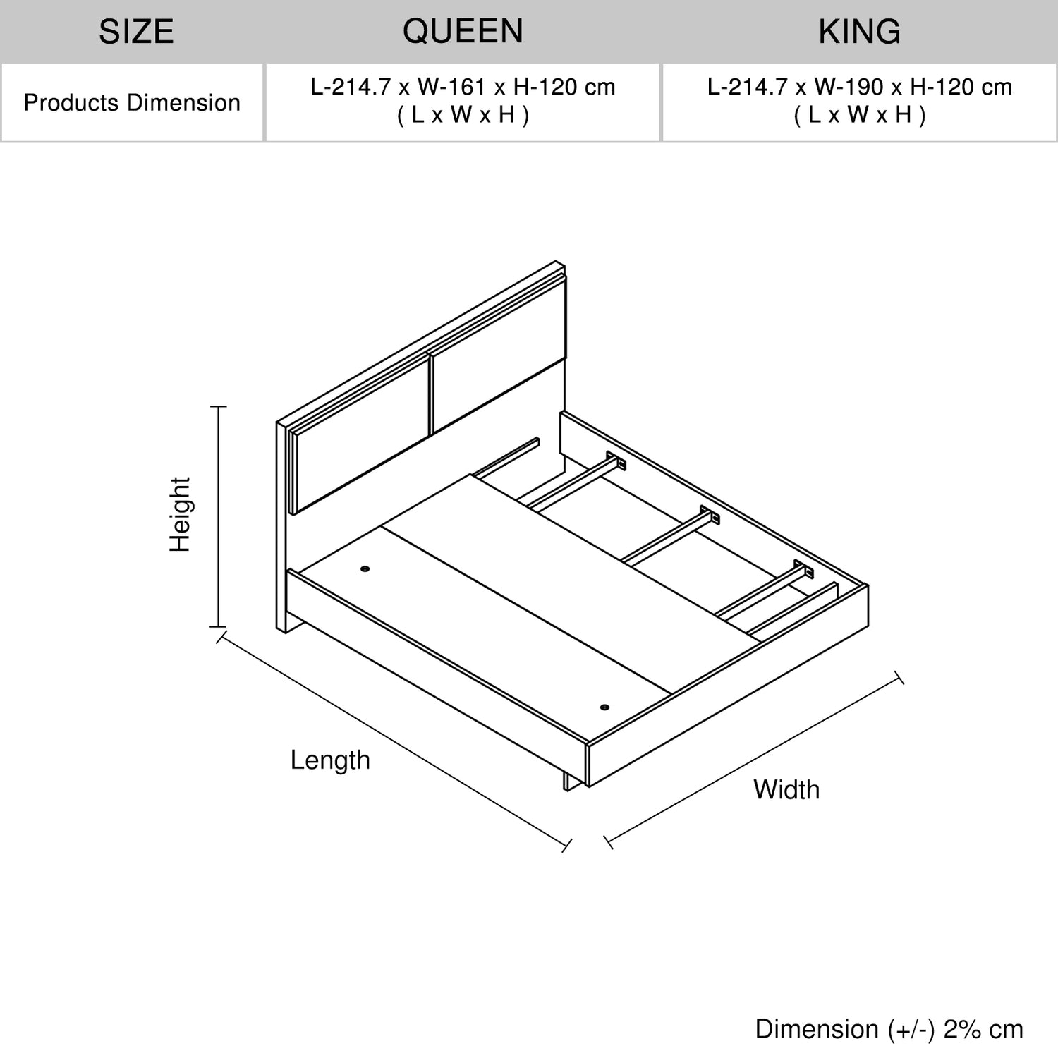 Queen: L-214.7 x W-161 x H-120